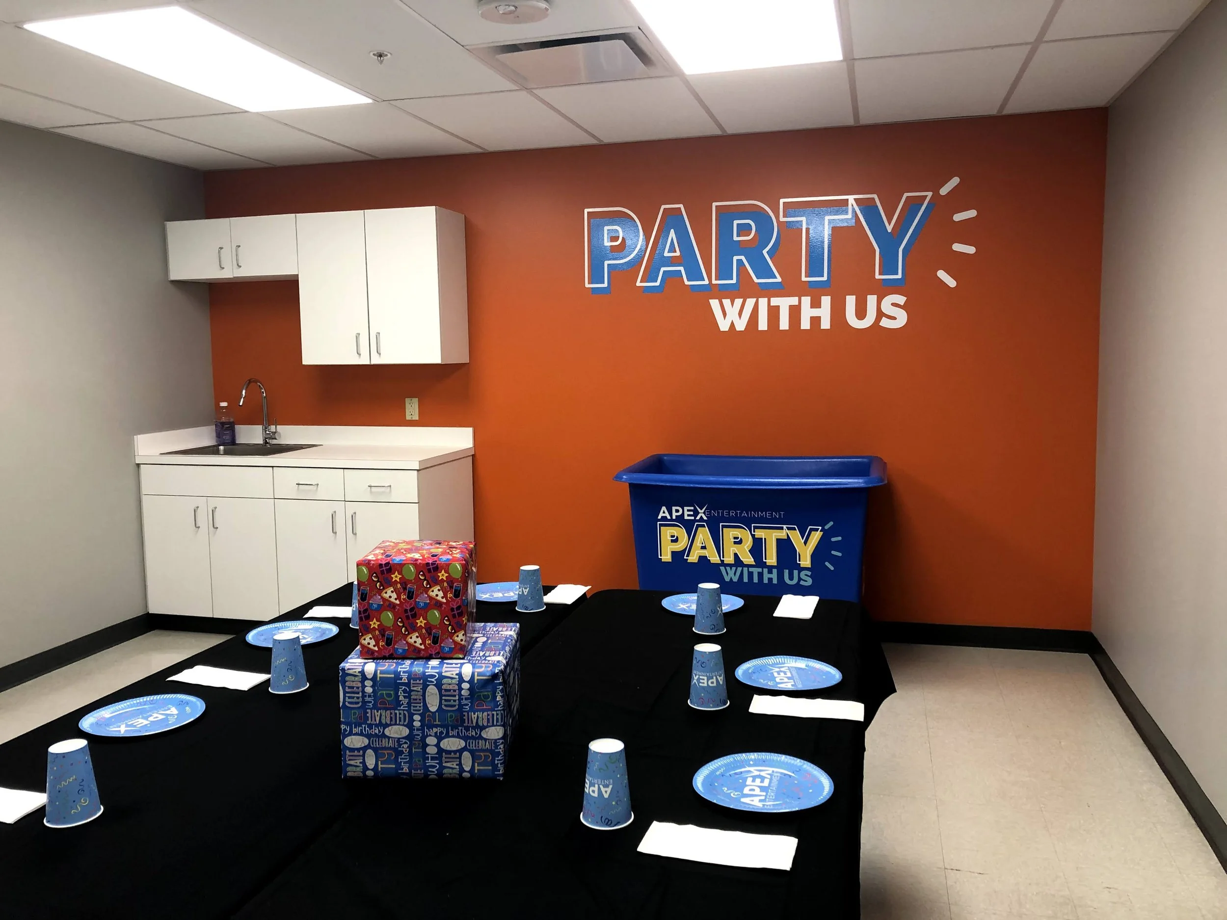 The kids birthday party rooms feature a large wall decal, branded party bins for gift and belongings storage, and a window decal signifying the room number.